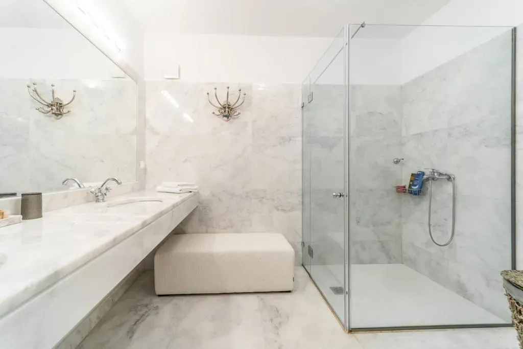 Step into a serene and stylish bathroom featuring top-notch amenities. Enjoy a refreshing experience with luxurious towels and premium toiletries