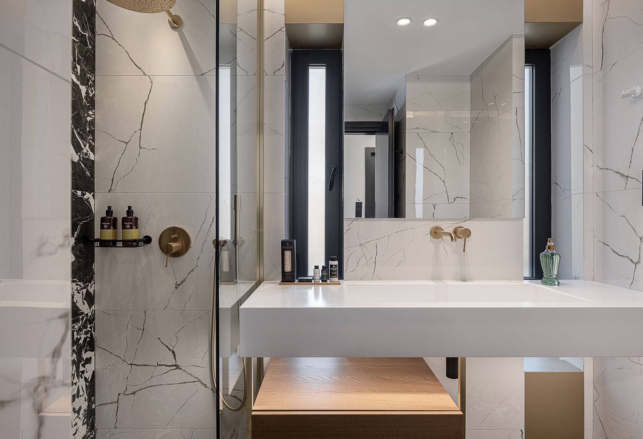 Step into a serene and stylish bathroom featuring top-notch amenities. Enjoy a refreshing experience with luxurious towels and premium toiletries