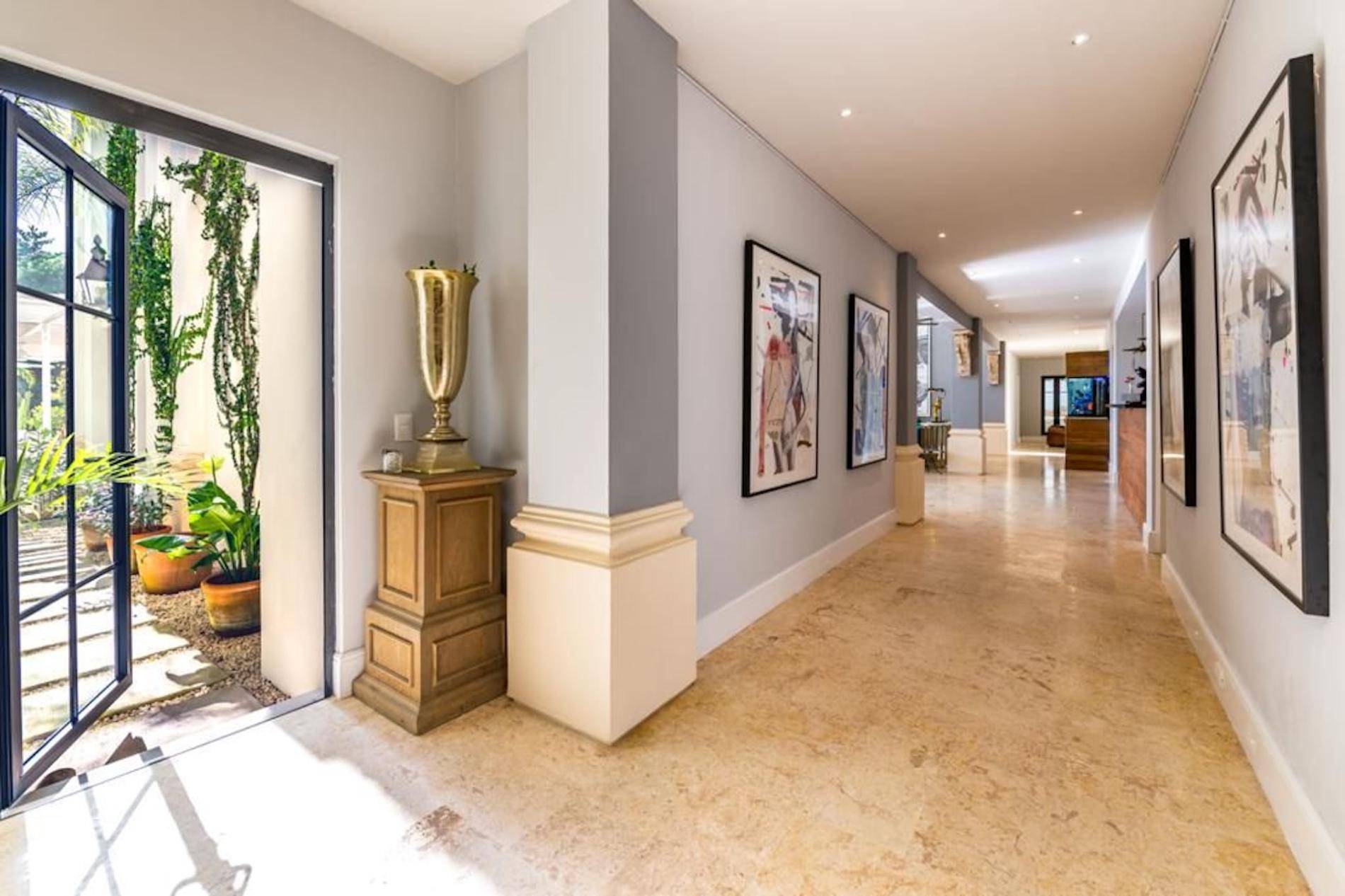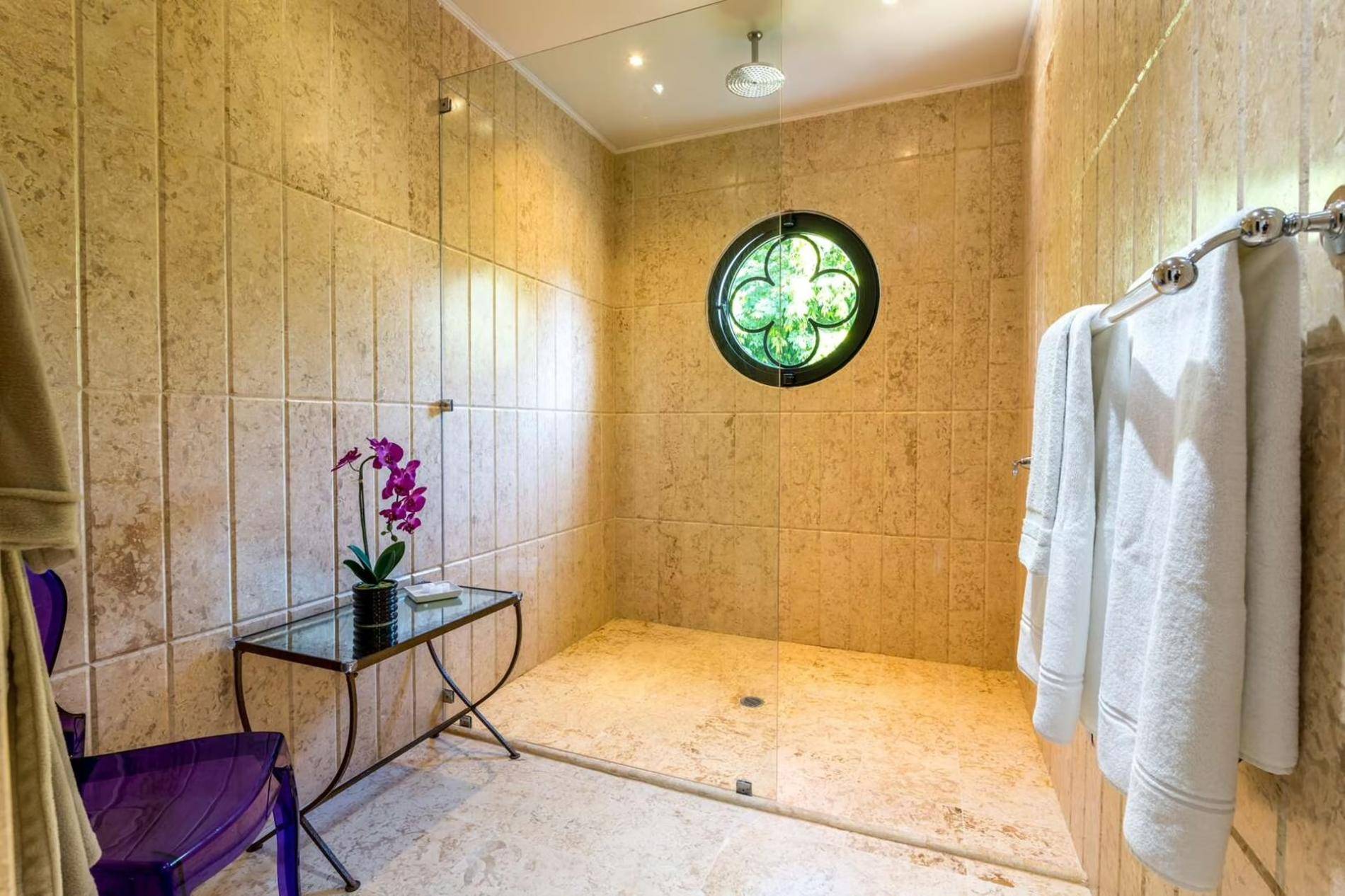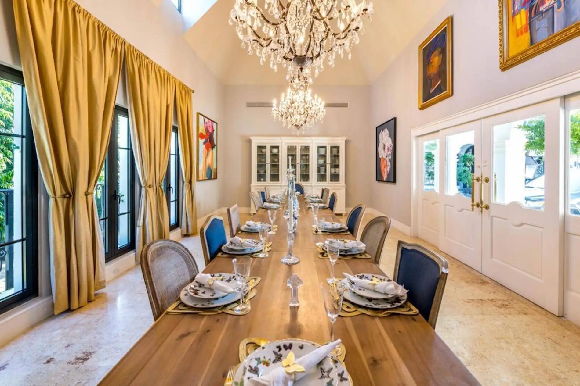 Behind its signature wooden gates, a grand stone courtyard welcomes you into airy hallways framed by white archways, orchids, and curated art. Inside, the villa features polished Coralina stone floors, six spacious bedrooms with en-suite bathrooms, and three additional half-baths. The elegant dining room seats up to 16 guests, blending vintage French charm with a curated collection of dinnerware, all next to a fully equipped gourmet French Blue kitchen.