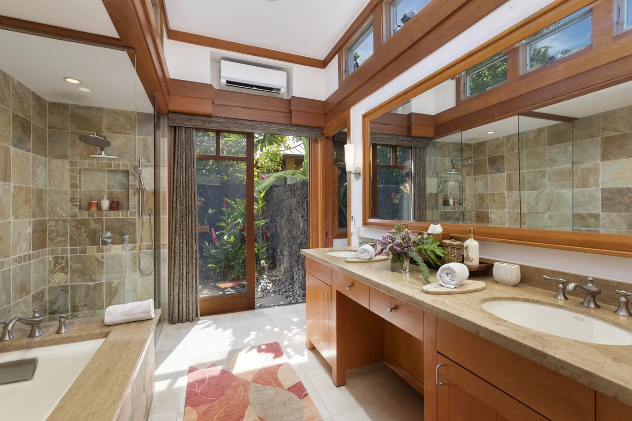 The primary suite is a sanctuary of tranquility, featuring lofted ceilings, a king-sized bed and wall-to-wall sliders opening directly to the pool. The ensuite bathroom includes a soaker tub, a tiled glass wall-enclosed shower, dual vanity, and high ceilings. A unique feature is the private access to a lava rock wall outdoor shower, adding a touch of island charm.