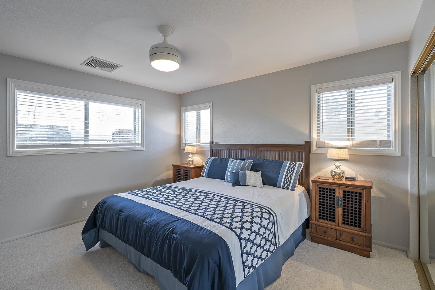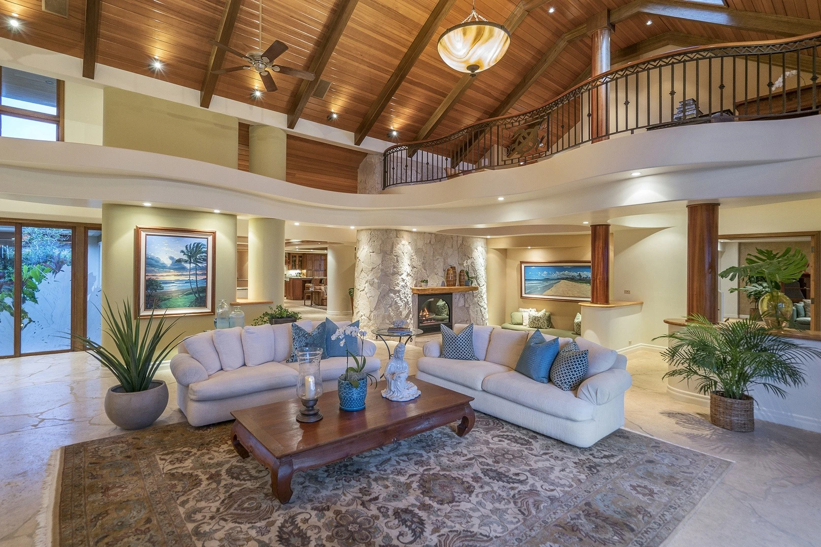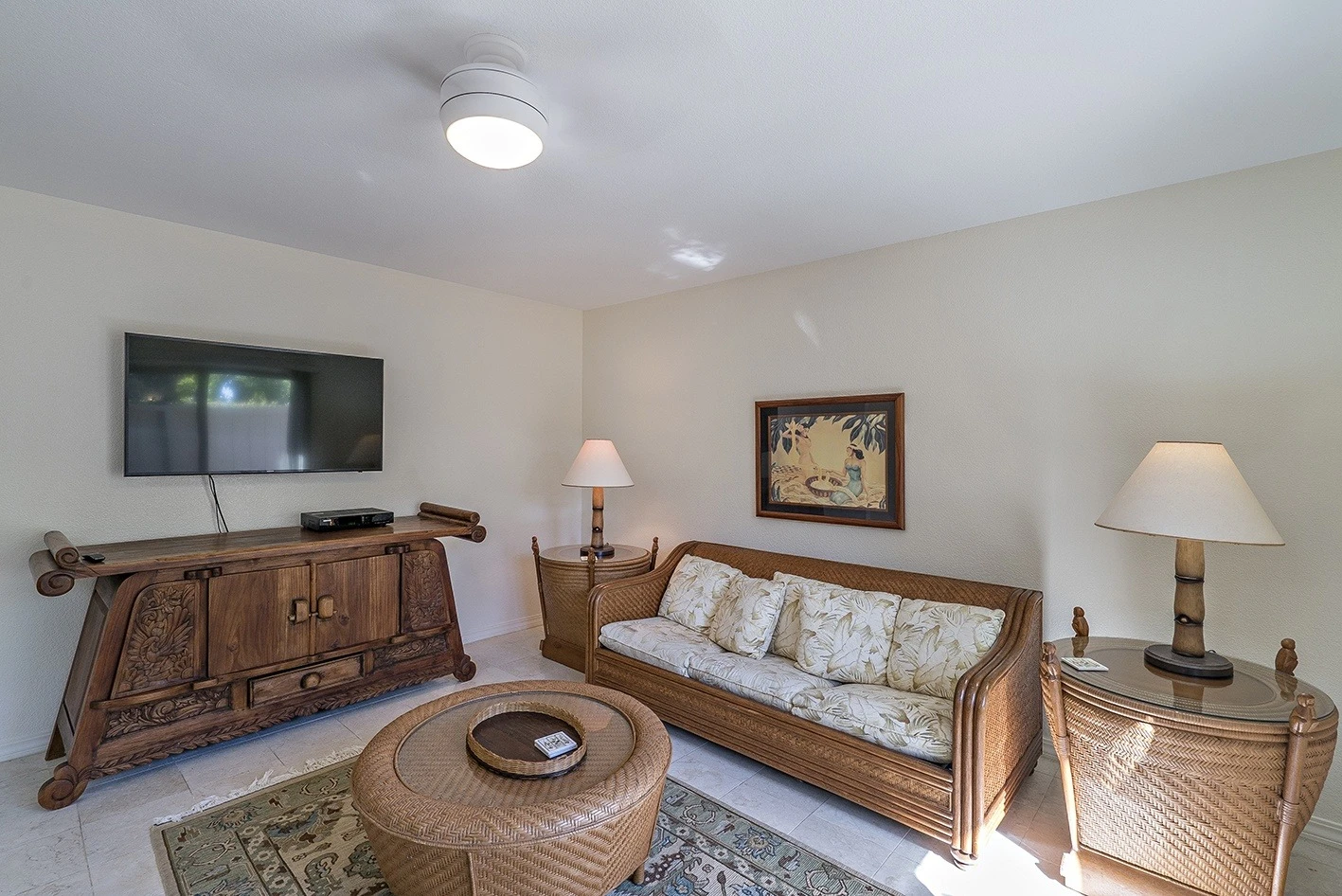 At the entrance of Ali’i Point #9 is the tastefully manicured koi pond and serenity fountain to usher you into your relaxing vacation. From the initial foyer and walkway, you enter the cohesive living room, dining room, lounge area, and gourmet kitchen. With plenty of ceiling fans and large sliding doors to let in the tropical breeze, this is the perfect place for your entire group to lounge and socialize throughout the day and long into the night. The spacious kitchen is outfitted with several stainless steel appliances, gorgeous Koa wood cabinetry, polished granite counters, a large central island, access to the back lanai (patio), incredible ocean views, and access to the other living areas. Adjacent to the kitchen is the dining area with a large table fit for up to 8 guests, as well as the lounge area with 4 comfortable captains chairs and a large coffee table for guests to enjoy. The living room next door is equipped with 2 large couches and a smart TV, with immaculate ocean views abound. To the side is a half bathroom for guests’ convenience.