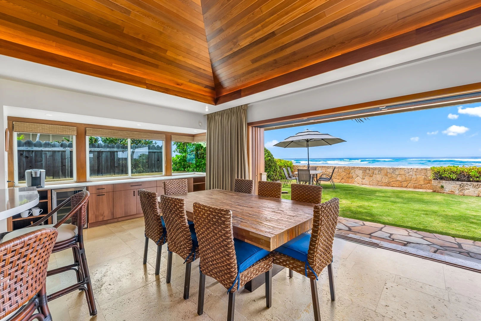 The vaulted living space at Hale Makai at Diamond Head leads to a grassy lawn surrounded by lush greenery, with the breathtaking ocean views giving you the real island experience right from your backyard. In addition to a private pool, the home comes equipped with a barbecue grill for casual meals at home.