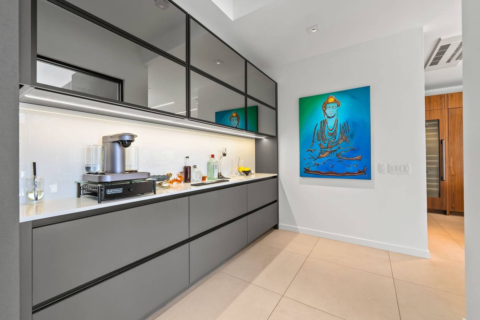 * Chef’s Dream Kitchen – A state-of-the-art kitchen featuring sleek cabinetry, high-end appliances, a wine cellar, and an oversized island for casual dining. (Please note: The wine display is an art piece, but a kitchen wine fridge is available for guest use.)