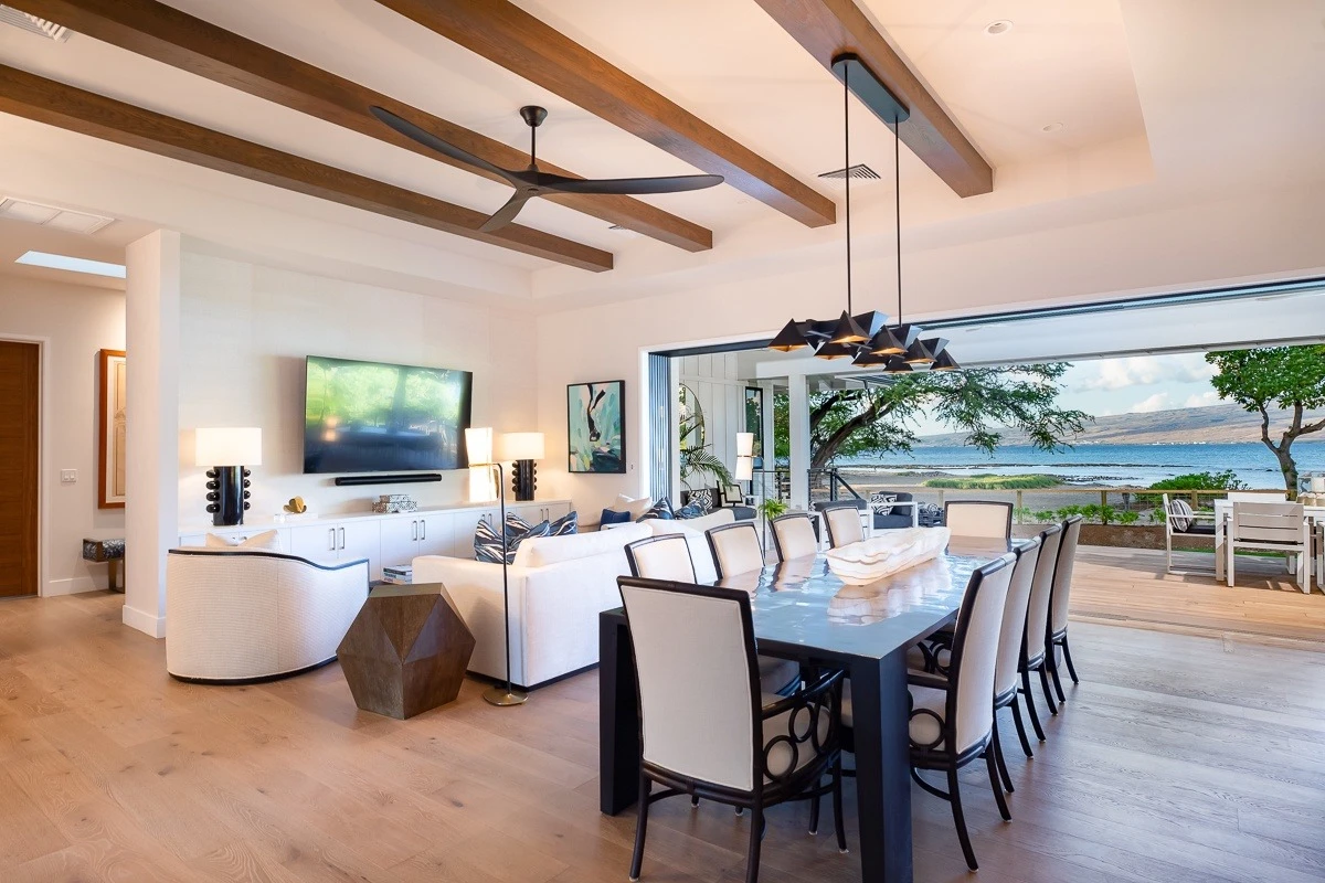 There is a small breakfast table inside that is fit for 4, or step out of the full-walled sliding doors to the grand covered lanai equipped with a large dining table fit for 10, as well as a grand barbecue grill station and several other seating & lounge options that overlook the private backyard, a perfect locale for evening festivities amidst the dazzling colors of the Hawaiian sunset or the mystical starlit night sky.