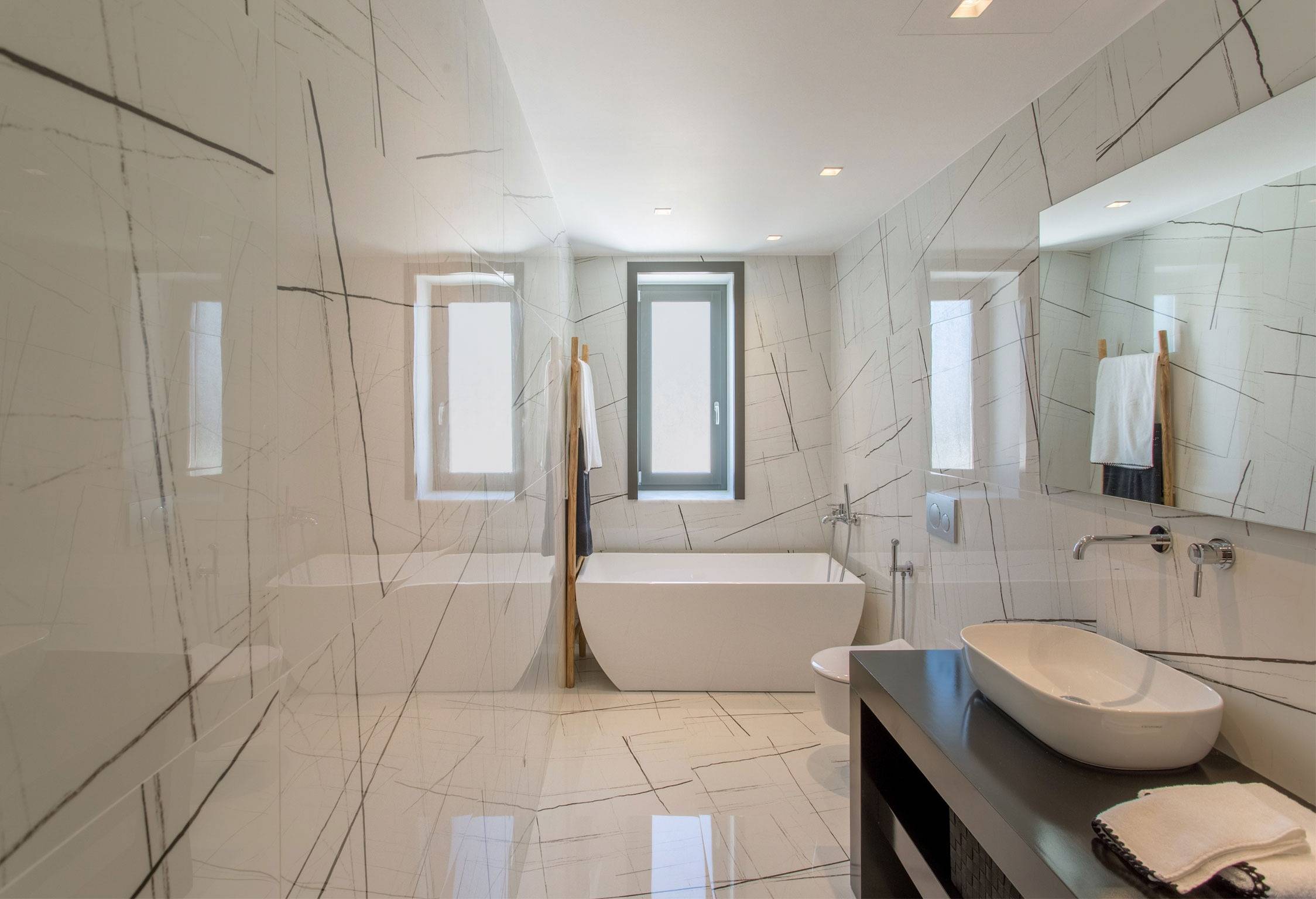 Step into a serene and stylish bathroom featuring top-notch amenities. Enjoy a refreshing experience with luxurious towels and premium toiletries